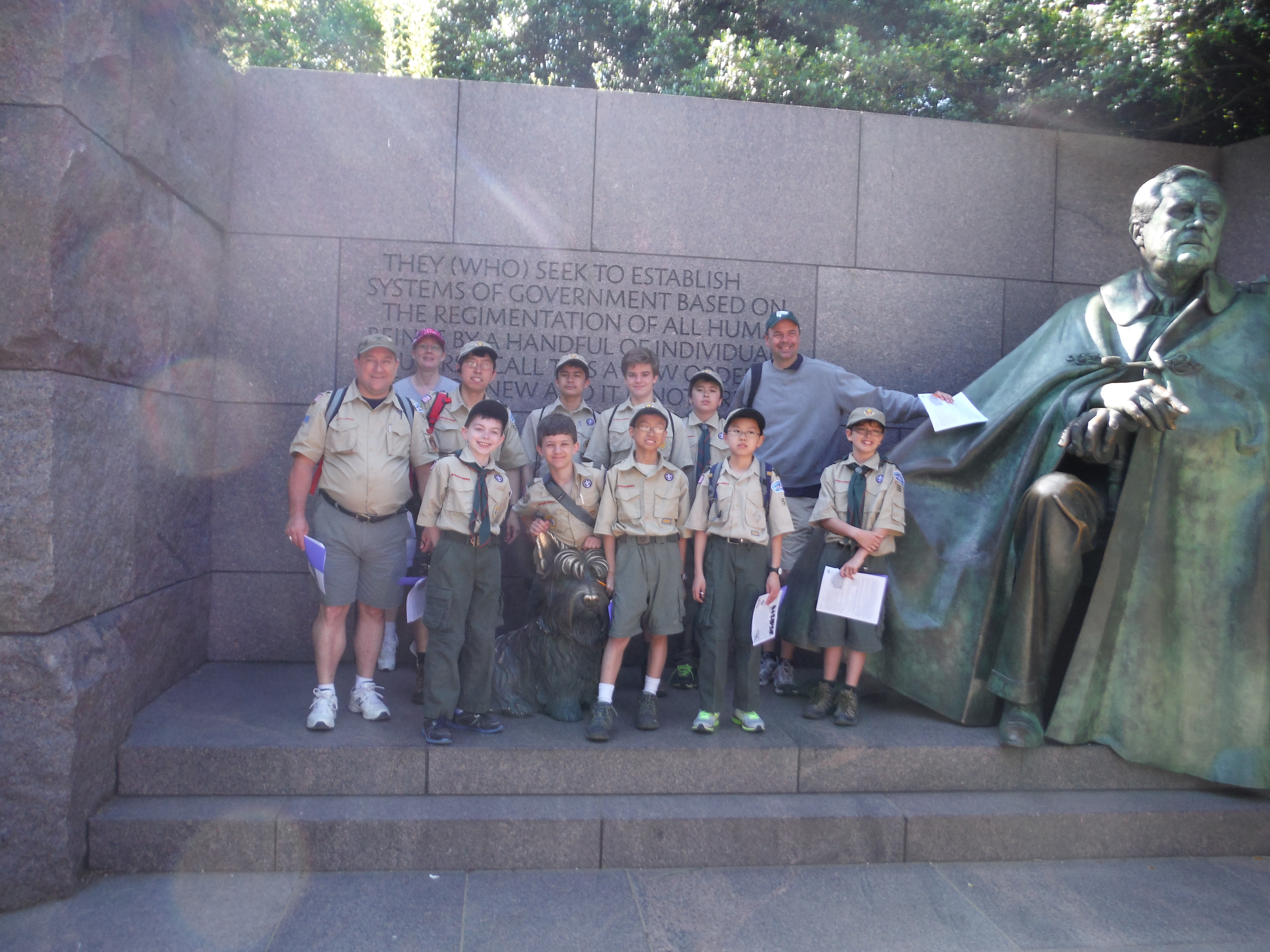 Starting the hike from the FDR Memorial the Scouts hiked around the National Mall, which included the major Memorials and Monuments, Boy Scout Monuments, Capitol Hill, and the Peace Monument. Along the route, Troop 55 Scouts paid tribute to the fallen, saluted our nation’s great leaders, studied scouting history by answering 21 questions, and did their civil “Good Turn” by removing trash from the streets. The Boy Scouts also cheered the riders of the annual Rolling Thunder Motorcycle Rally honoring POWs and MIAs.