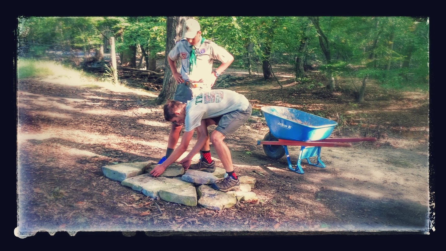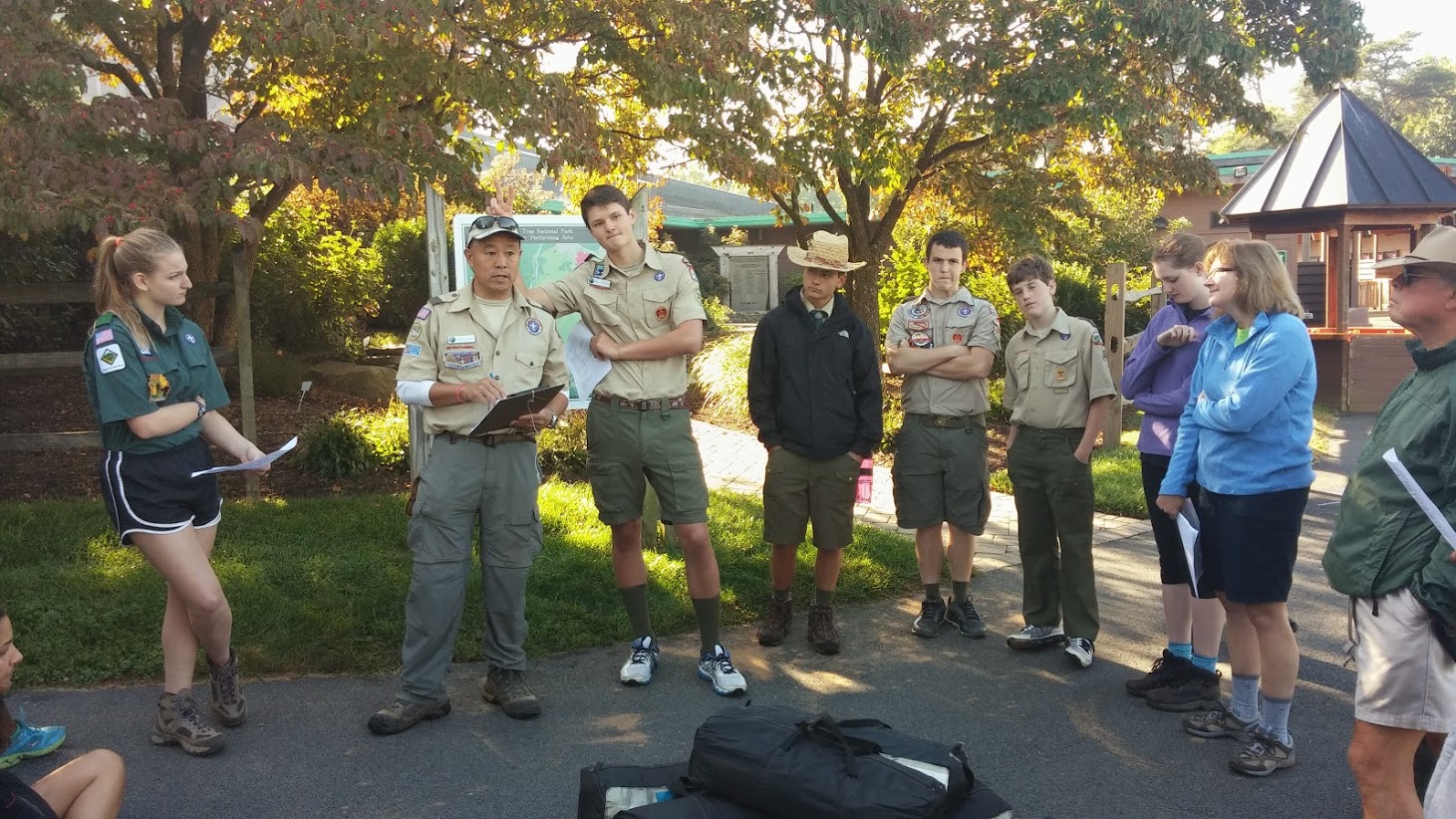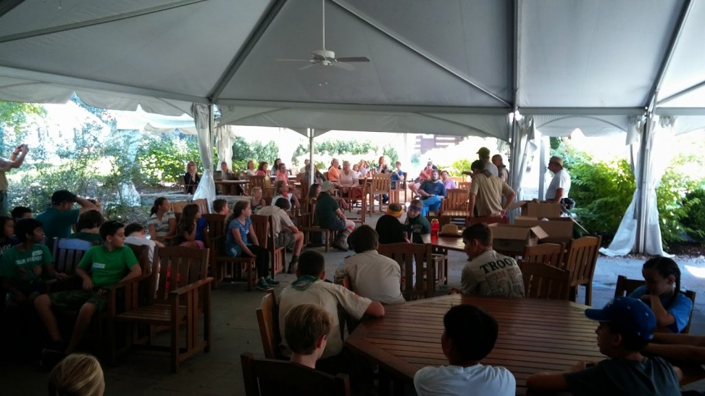 The volunteers arrives at 8:00 a.m. on Sunday morning to prepare the equipment and the camping area, which was located in a large field and part of the woods next to a stream. When the campers arrived at 11:00 a.m., they left their parents and joined in on a game of sharks and minnows led by Thomas Windus. Scouts eventually led the campers to the field where they were split up into patrols of 9 campers, one Troop 55 scout for patrol leader, a venture scout assistant patrol leader, and an adult volunteer. Each patrol conducted team building activities and thought of a patrol name. The four patrols were the Pokemon, the Bandits, the Seahawkz, and the Brownies.