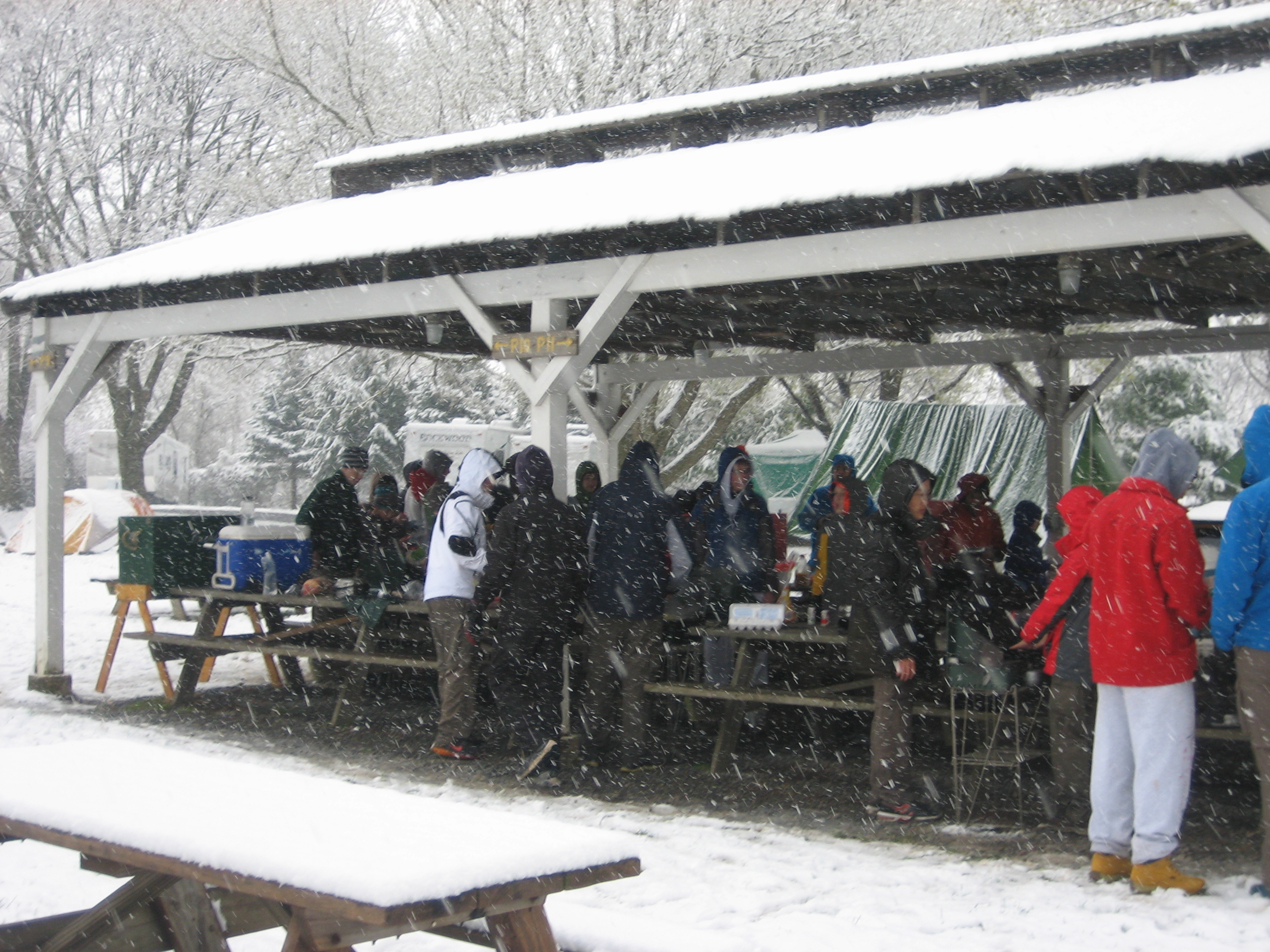 We had a fire ring but there was a little trouble getting it started because of the snow/rain but once it was going, it stayed lit throughout our skits. We went to sleep around midnight.