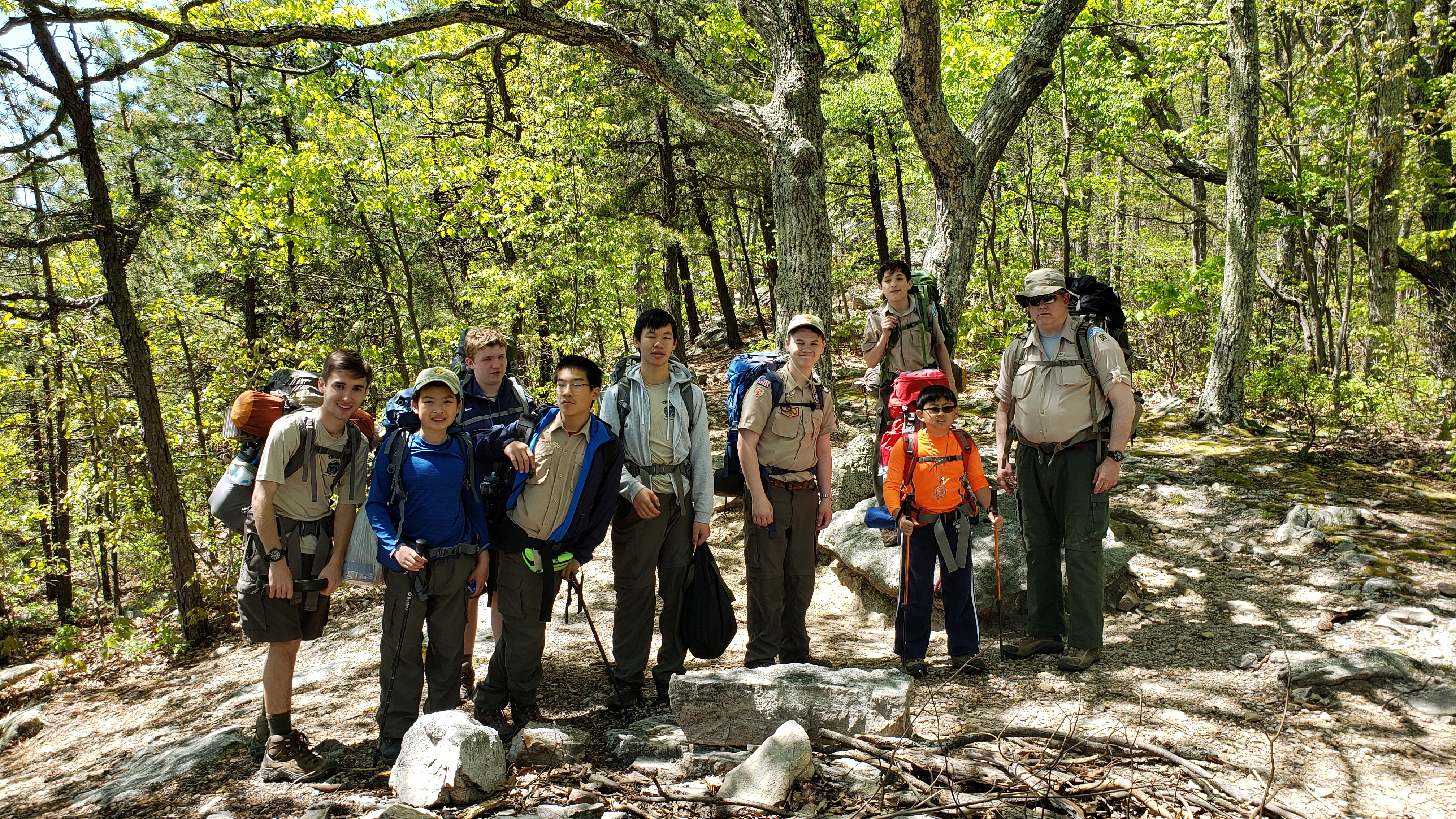 During the April outing, Troop 55 did a 10-mile hike at Signal Knob. The Scorpions hiked with the Eagles. In 2.5 hours, we made it to Signal Knob where there was a radio tower. Since we were the first group up, we quickly occupied the closest campsite. The campsite was spacious; the fireplace was tidy; and the benches were comfortable.